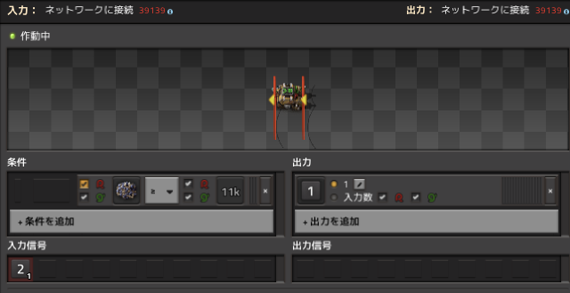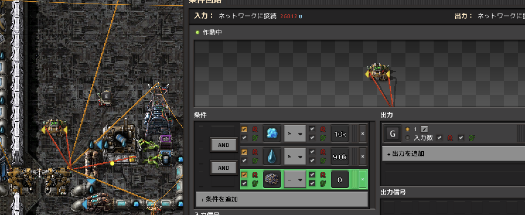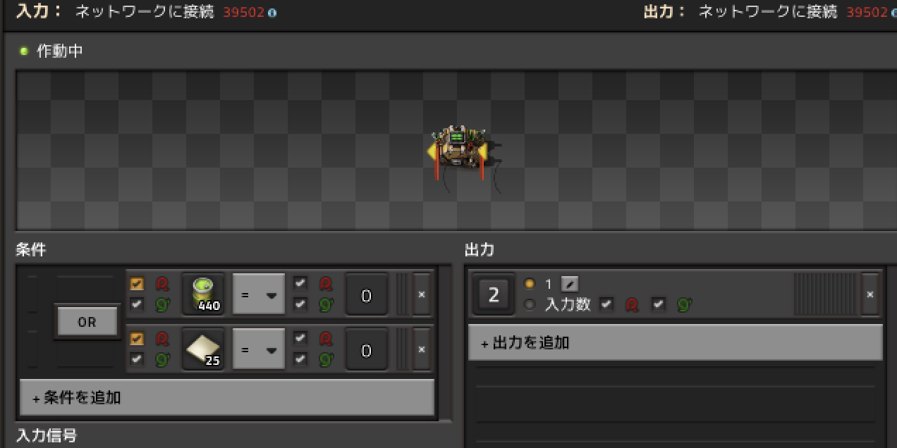 出発条件はこれはorで設定すればよいですが、補給物資は数的に少なくすぐに荷下ろし完了してしまうため、粉砕したナクイウムなどの積み込み時間を確保したいです。 そのため、補給物資が空になり、かつ現地の粉砕したナクイウムが0個である場合に出発させることで、補給物資が無くてもその時溜まっているものを全部積み込んでから終了するようにしています。 このとき、赤ケーブルで現地の情報を取得すると積み込んだものと混ざるので、現地のものは緑ケーブルで取得しています。