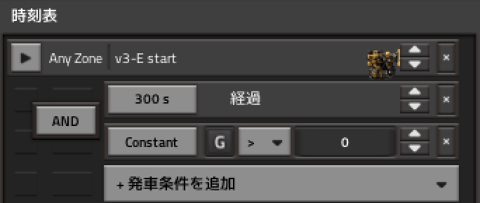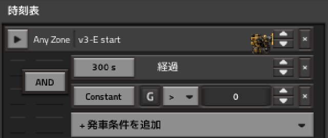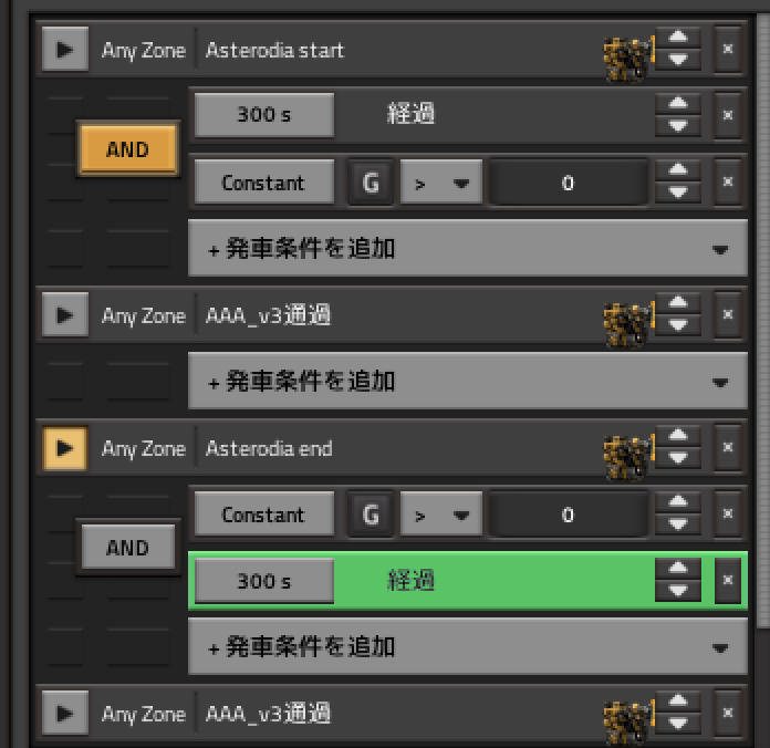 自動化の際はG(Go)=1を出発シグナルとして利用し、母星現地ともに条件回路で出発したいときにこれを入力します。 条件回路に設定しきらない補給物資や、開拓時に手動で止めたい場合などに使うためにざっくり300秒の待機時間も設定しています。 それ以外の絶対に満たしておきたい条件は条件回路で設定しています。